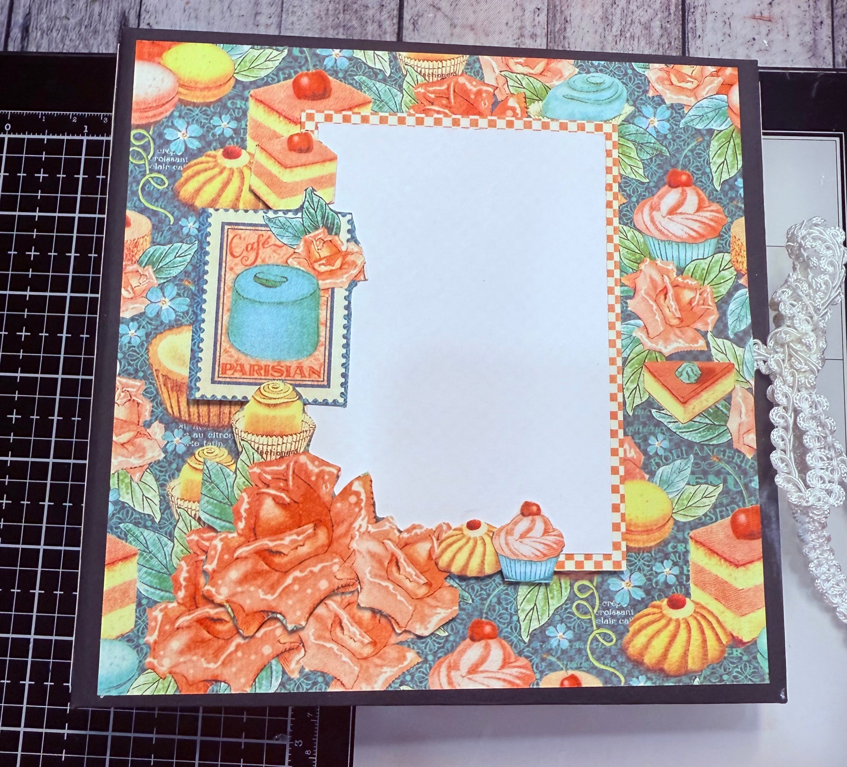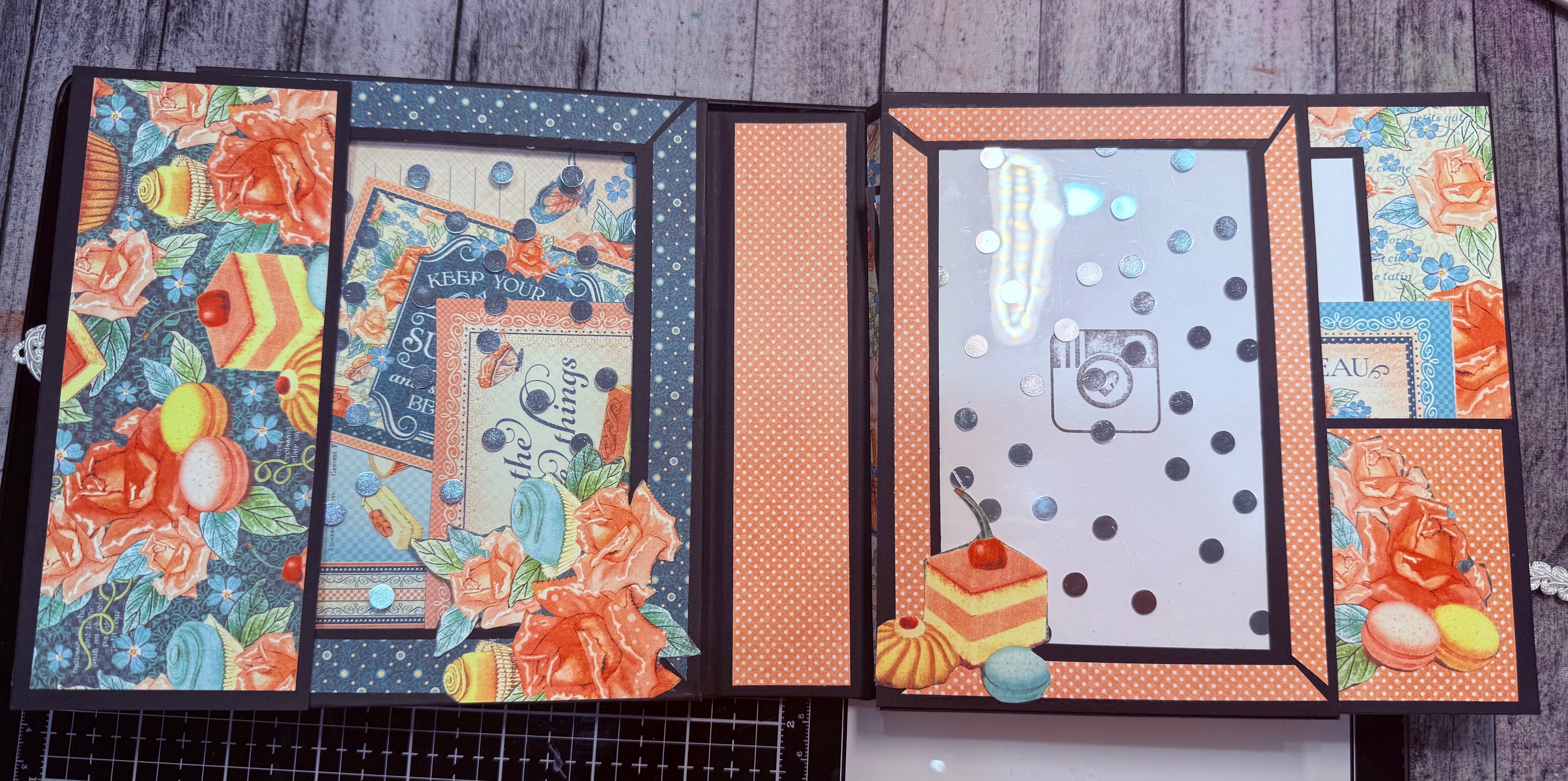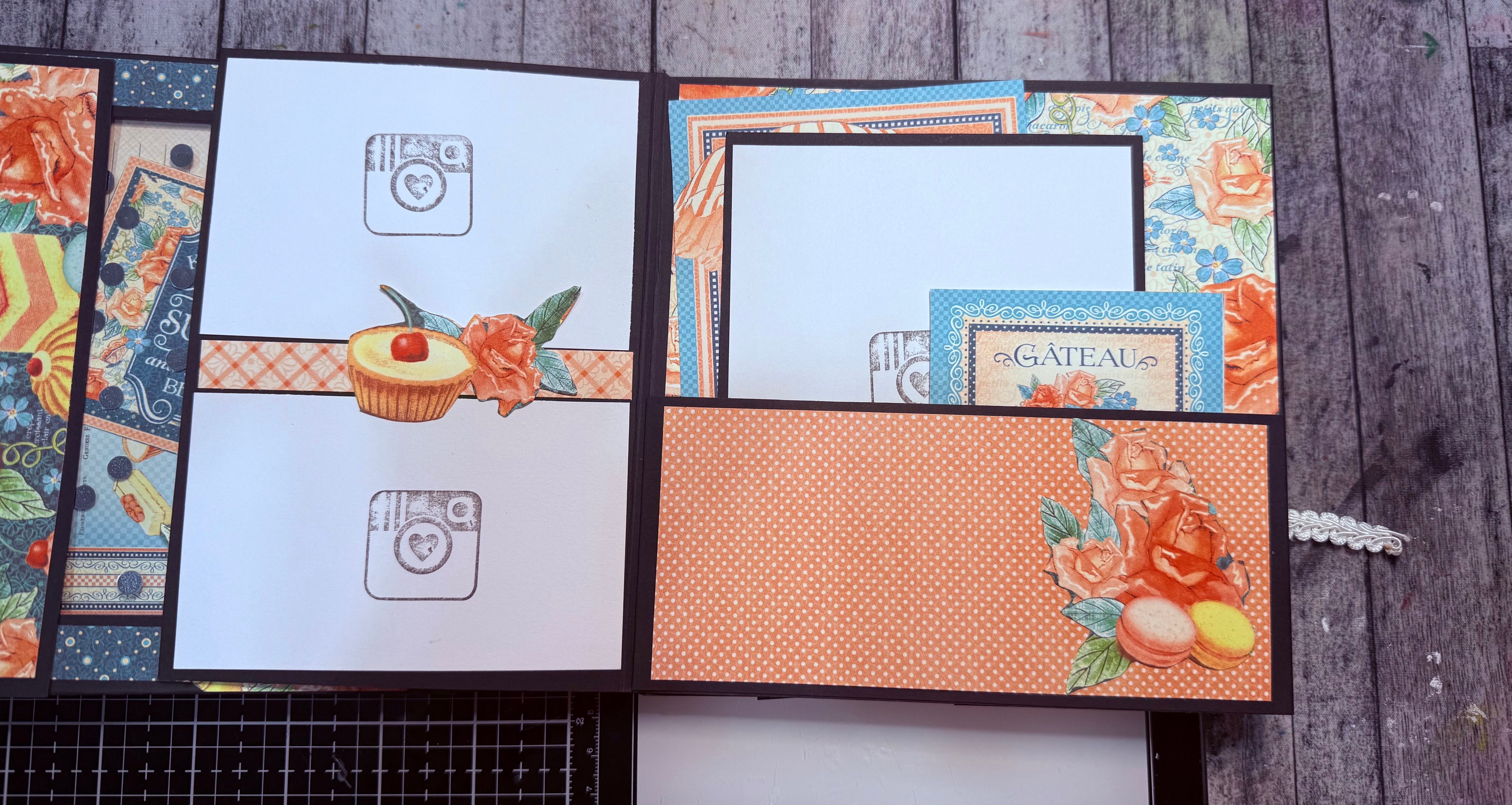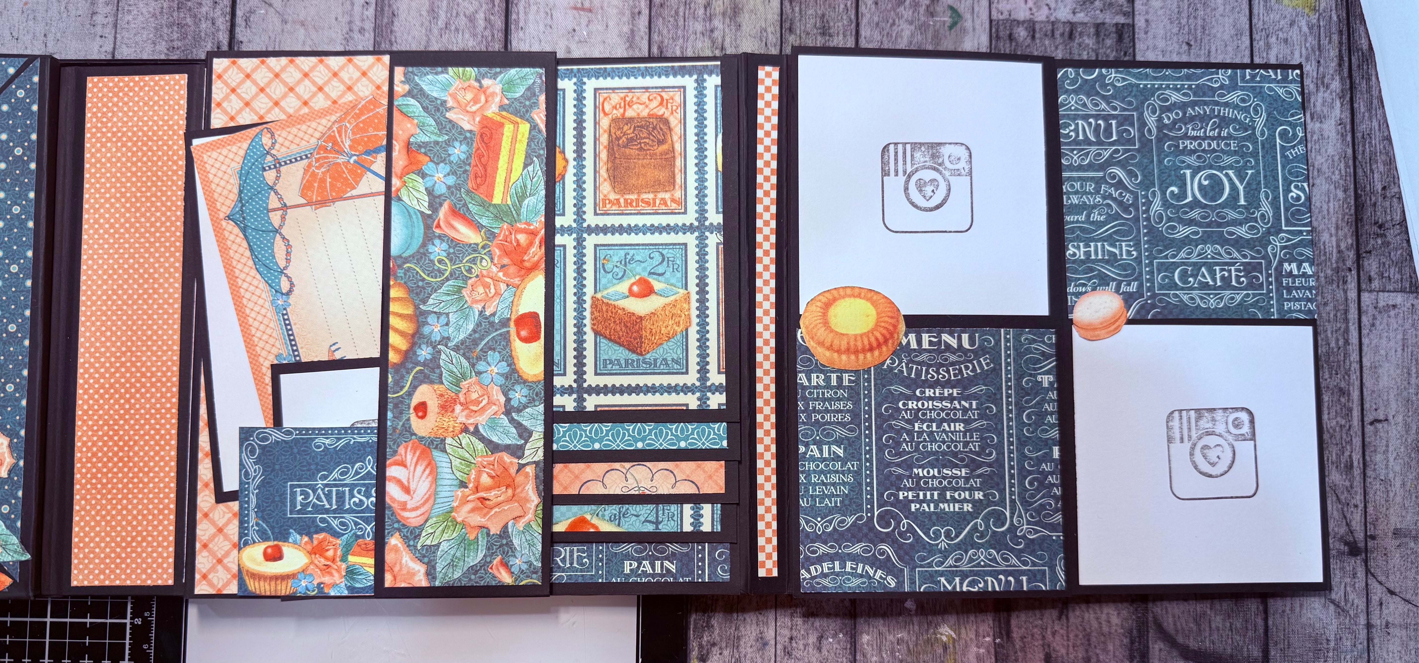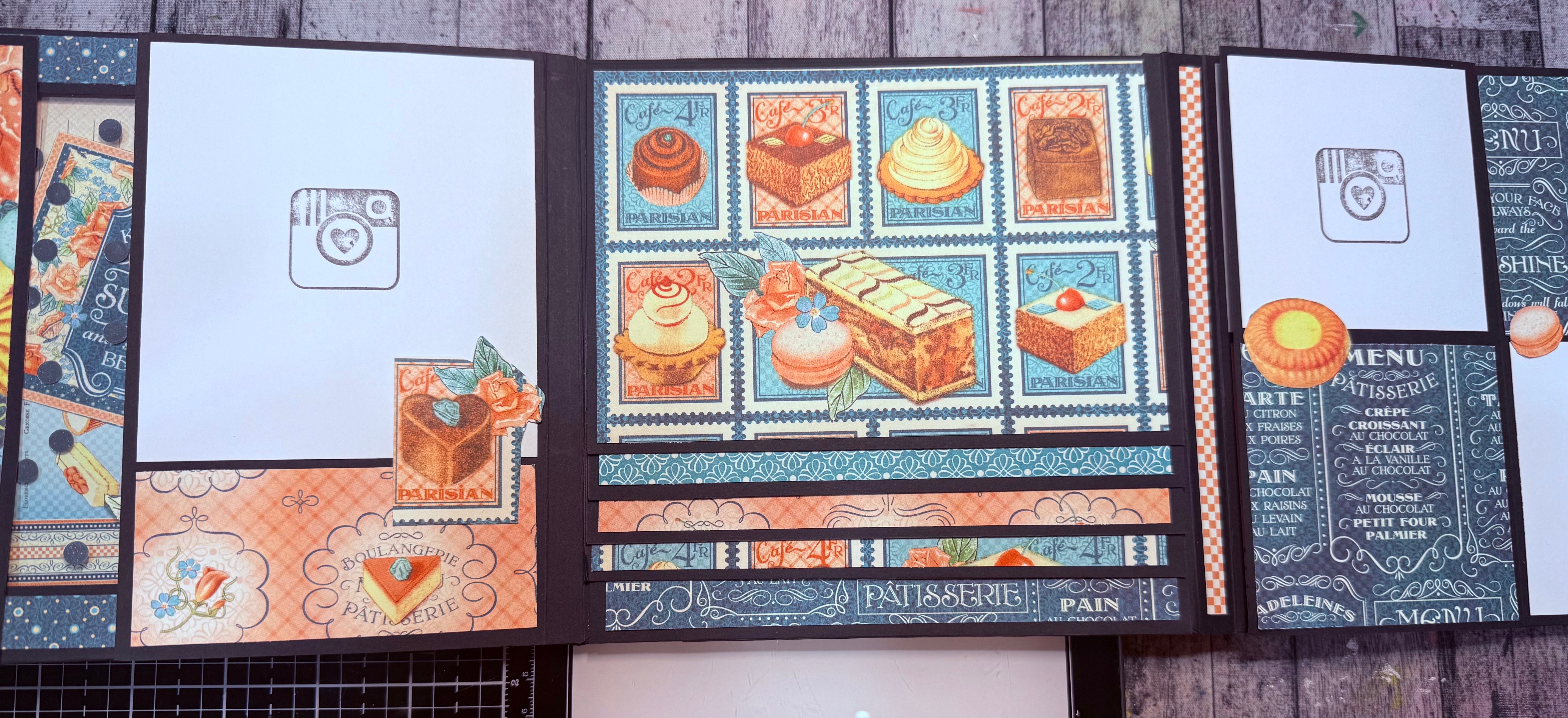 The gatefold book, both Francis & Laura’s book were just so beautiful I joined. I’m excited to make the other projects as well. This is the 1st book I’ll have made using my own ideas for the designer paper 🙈Here are some pics of where I’m at with the book. The cover isn’t glued down yet, and the charcuterie board has a magnet. Forgive my messy photos.