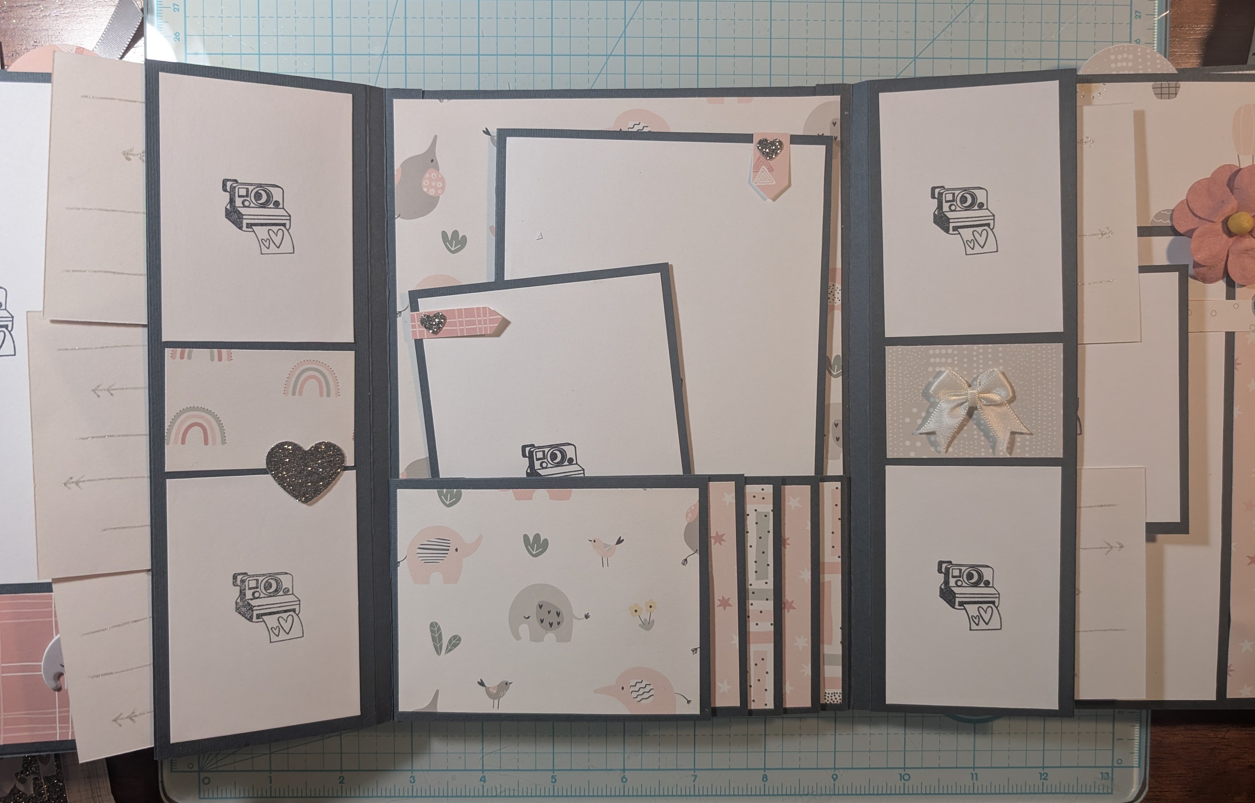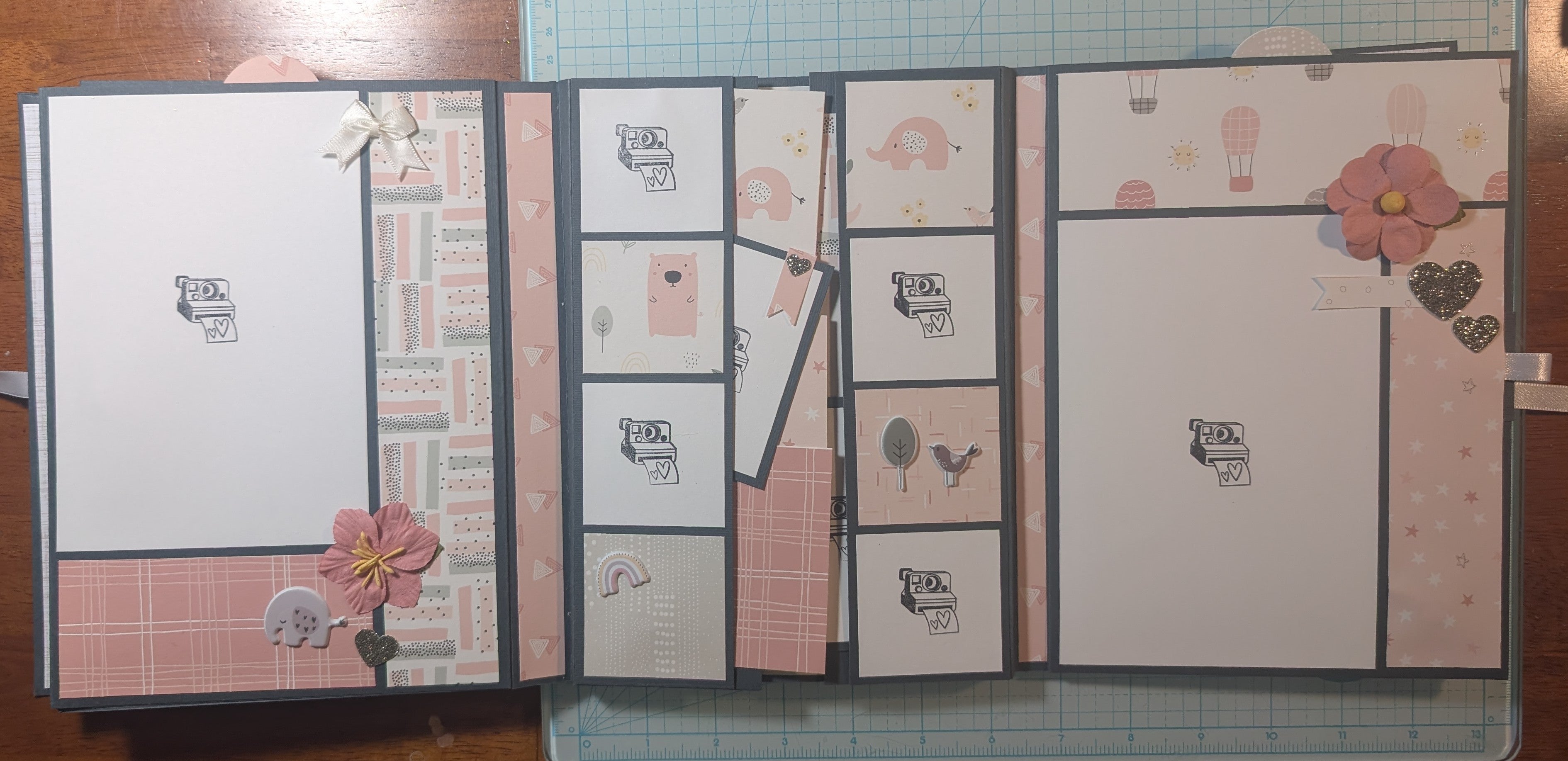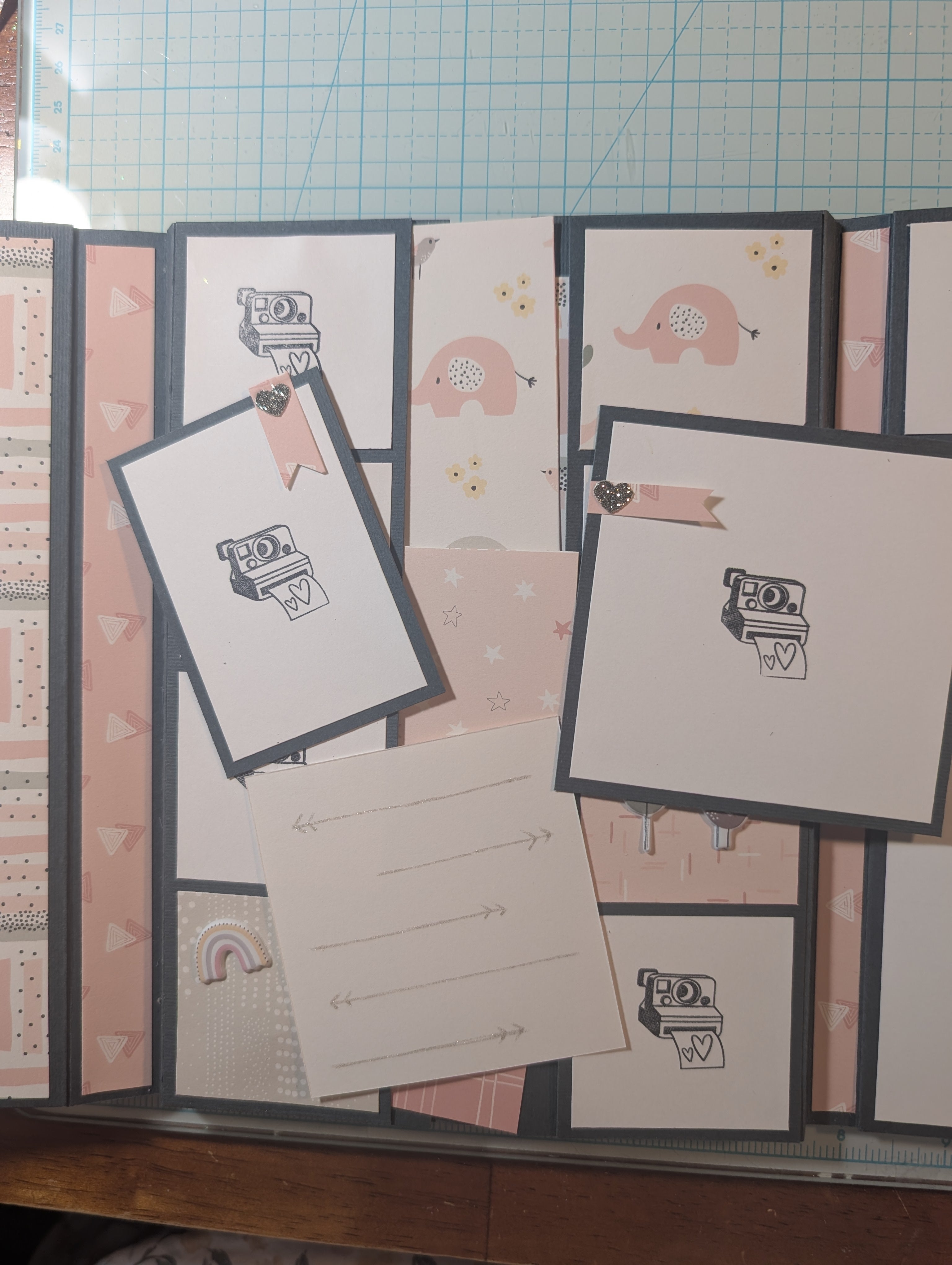 Challenge complete. Sweet baby book made with a Modascrap paper set. Very sweet paper. A very soft coral pink. I added the metal baby thingies to the shaker cover. I've had them for a long time, but I'm sure HL is where I got them. I added another page pocket so I could have two top inserts.