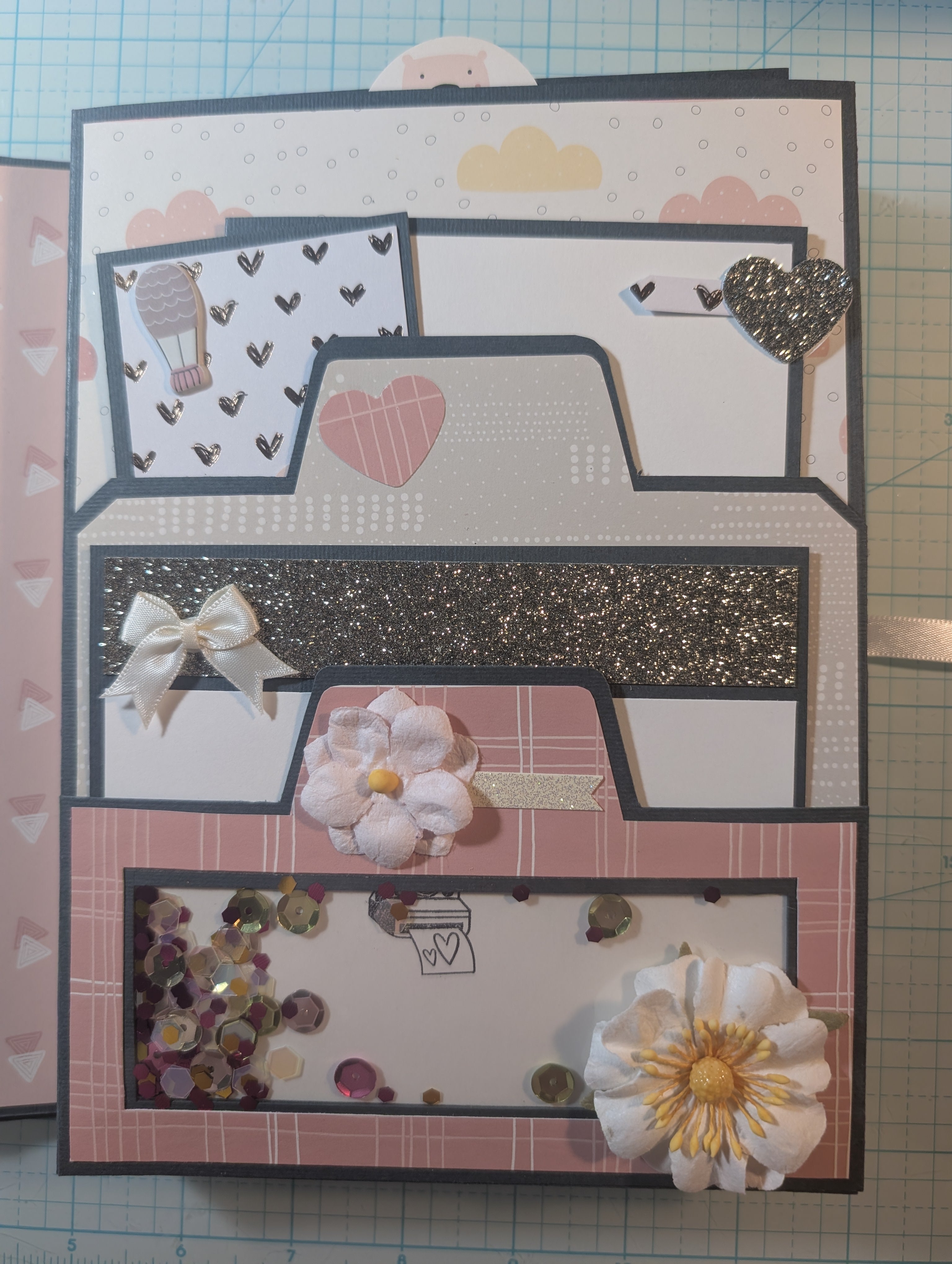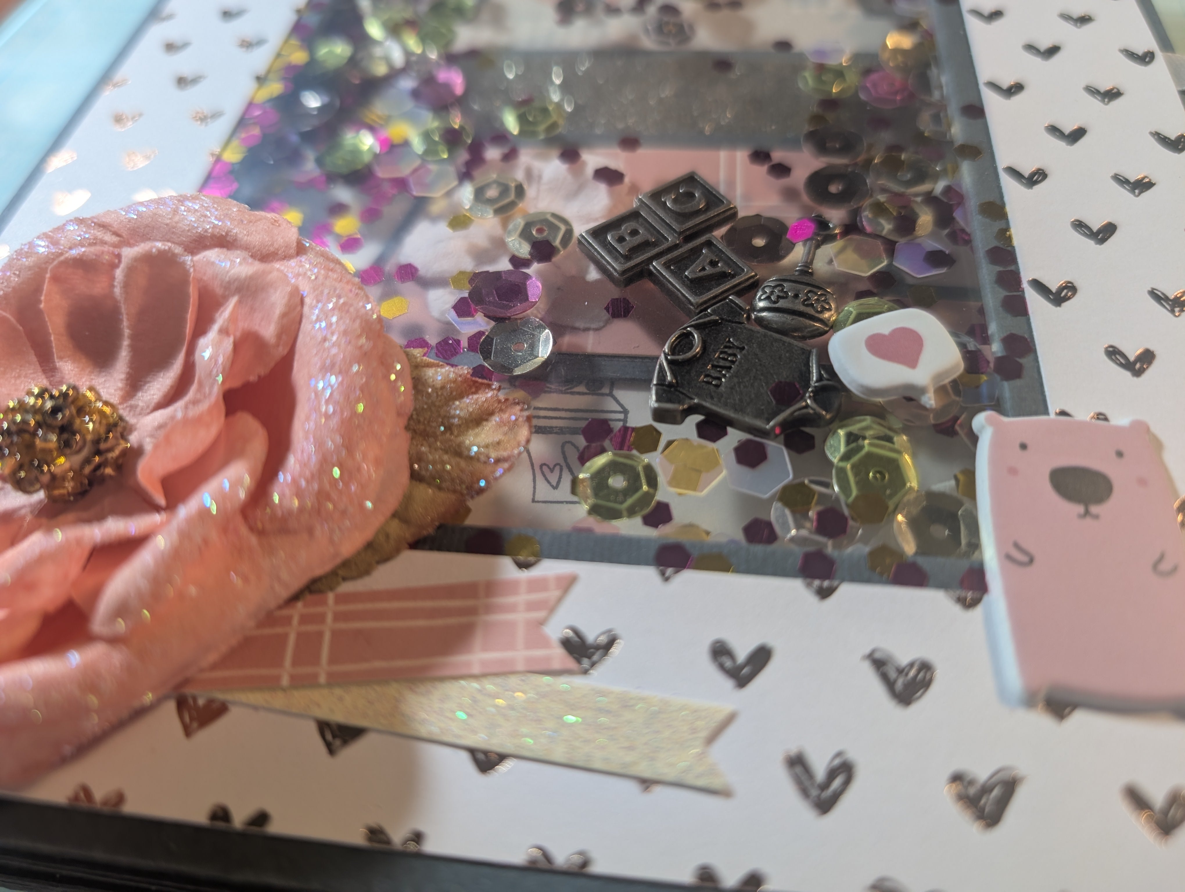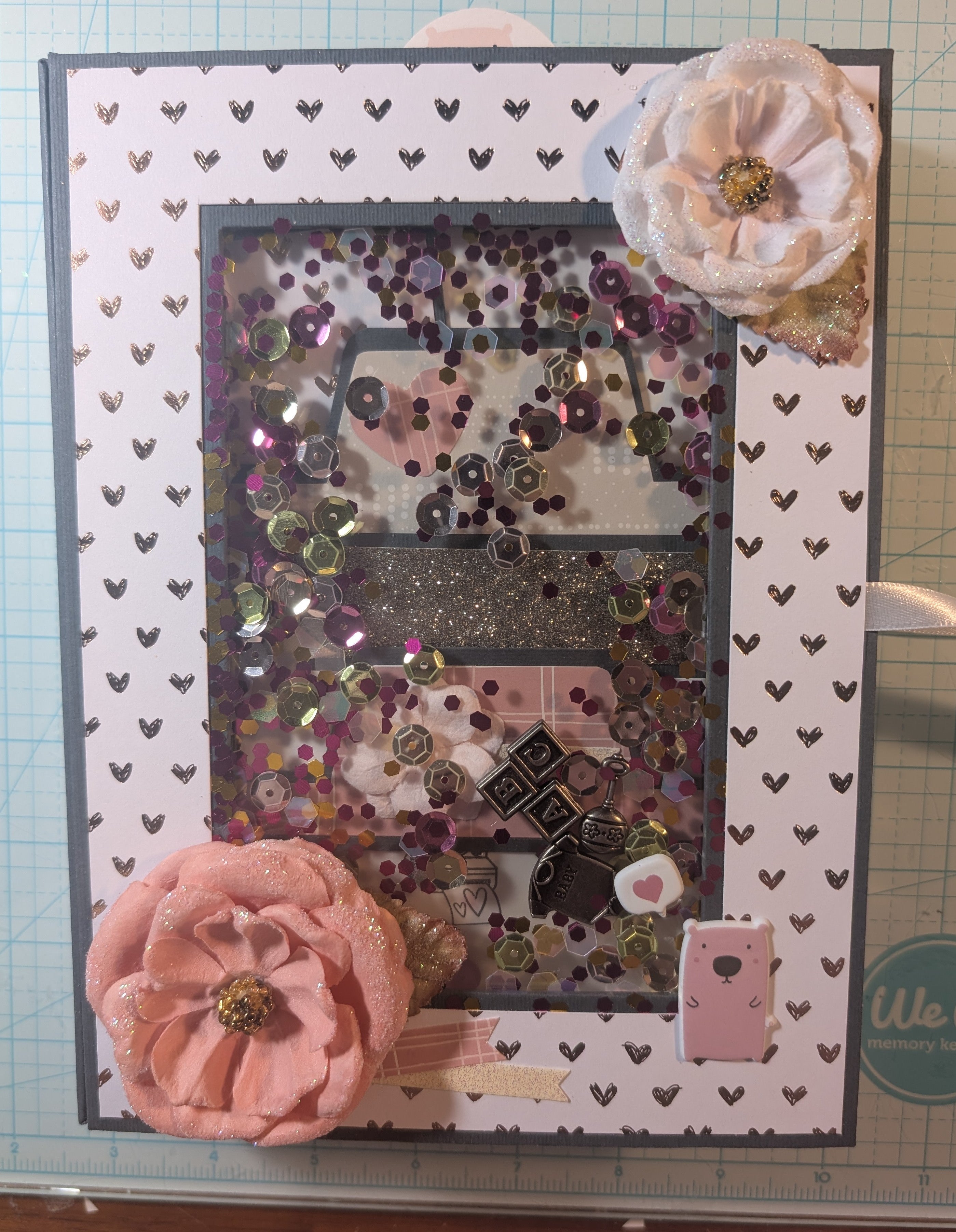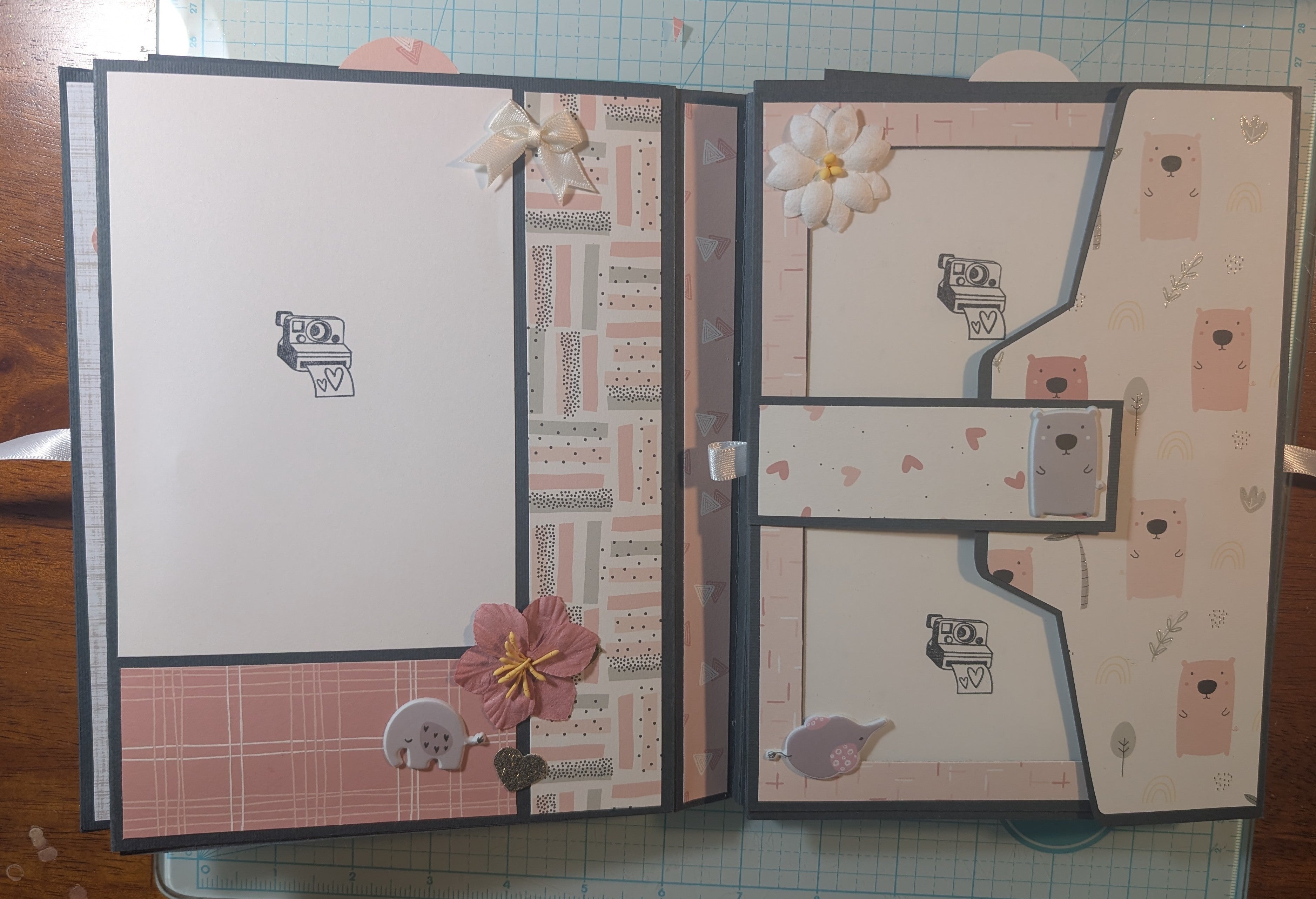 Challenge complete. Sweet baby book made with a Modascrap paper set. Very sweet paper. A very soft coral pink. I added the metal baby thingies to the shaker cover. I've had them for a long time, but I'm sure HL is where I got them. I added another page pocket so I could have two top inserts.